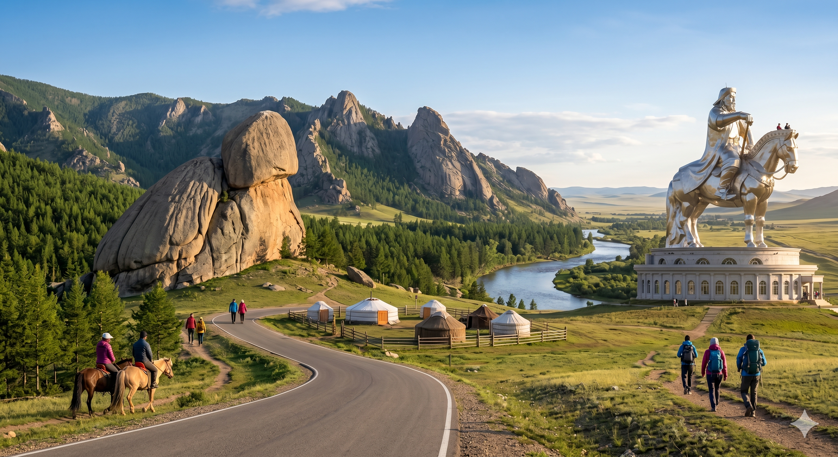 [최고의 접근성] 솔직히 말해 테렐지의 가장 큰 장점은 편하다는 겁니다. 도시에서 느긋하게 아침을 먹고 출발해도 점심때면 산속 초원에 서 있을 수 있습니다. 가는 길 내내 매끄러운 아스팔트 도로가 깔려 있습니다. 무거운 4륜 구동 차량도, 목숨을 건 각오도 필요 없습니다. 평범한 승용차에 연료만 가득 채우면 됩니다. 풀숲 사이에 진흙탕 타이어 자국이 세 줄 나 있는 게 '도로'의 전부였던 몽골 오지를 경험해 본 분들이라면, 이 매끄러운 검은 도로가 얼마나 큰 안도감을 주는지 아실 겁니다.